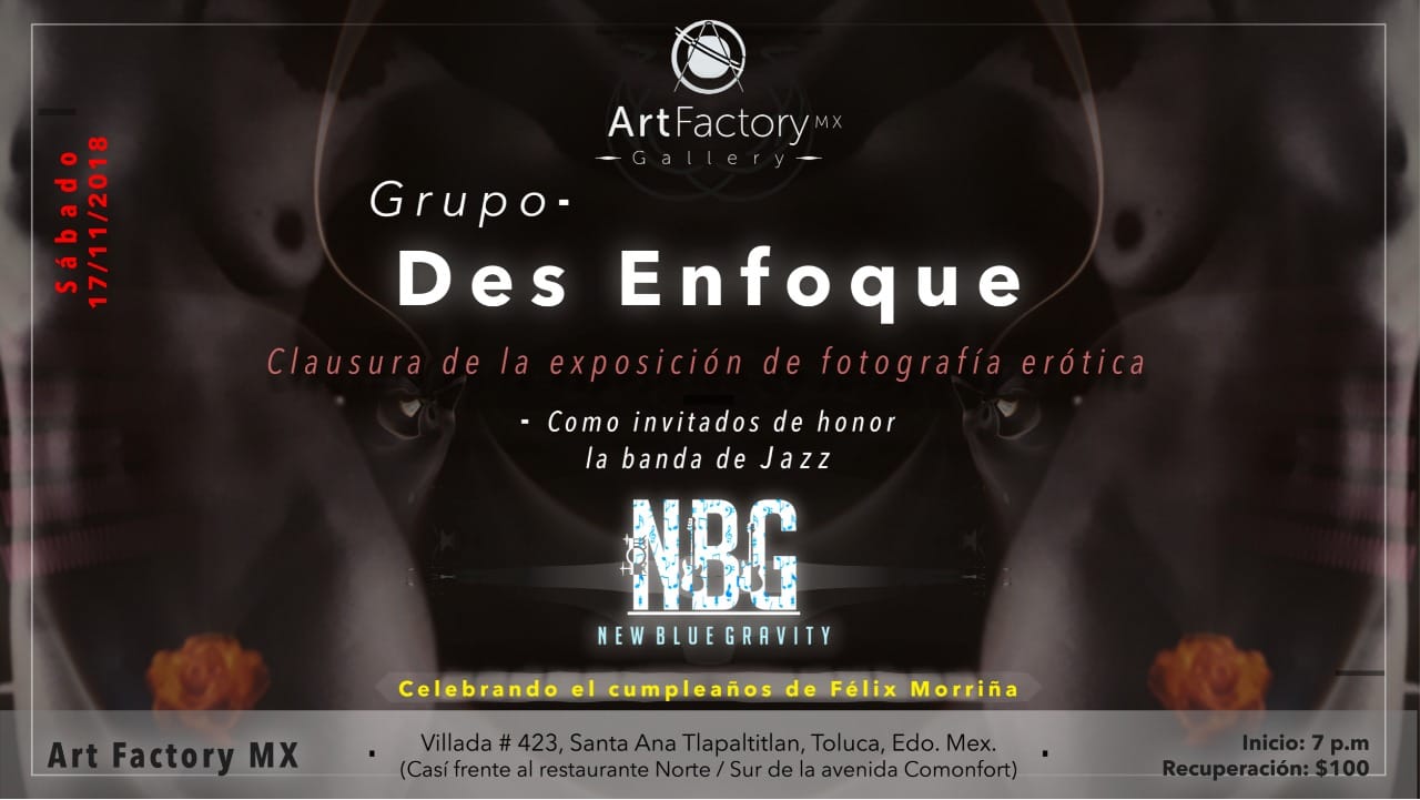 A partir de las 19:00 en Villada #423, casi esquina Comonfort (frente al restaurante Norte/Sur), Santa Ana Tlapaltitlán, Toluca, México, se llevará a cabo la clausura de la exposición de fotografía erótica del Grupo Desenfoque Fotógrafos Descocados (integrado por Guillermo Romero Zarazua, Juvencio Larrañaga, Manuel Larrañaga, Ivan Gomez Ortiz, Diogenes Dominguez Hernandez y José Luis Rubí).