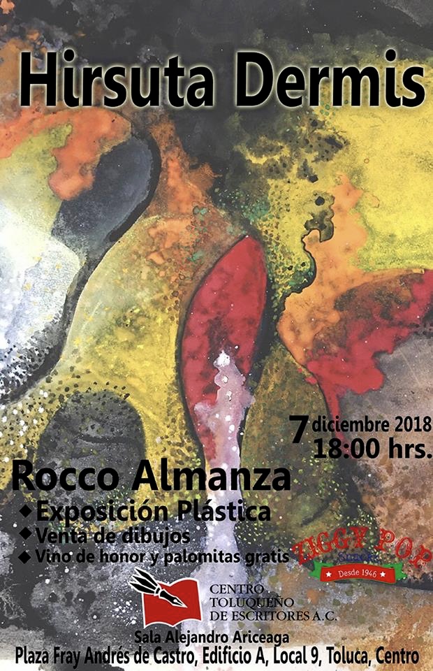 Por tanto, dedicarse al Arte es algo más o menos “enfermo”; y uno de los seres más enfermo y más artista que he conocido es Rocco Almanza, quien ha hecho de su trabajo como dibujante y pintor (principalmente) un oficio de vida, congruente en discurso plástico (como en la vida misma) Rocco no concede, no se anda con medias tintas, su actitud como su propuesta pictórica es contundente, crítica, furiosa, poco amable, y a la vez generosa y rica en expresión. La mirada que presenta Almanza en Hirsuta dermis es fundamentalmente emotiva, responde al más puro estilo expresionista abstracto, al uso desmedido de colores, deformaciones y composiciones con trazos vigorosos. ¿Hirsuta dermis… la pintura de la enfermedad o la enfermedad de la pintura?