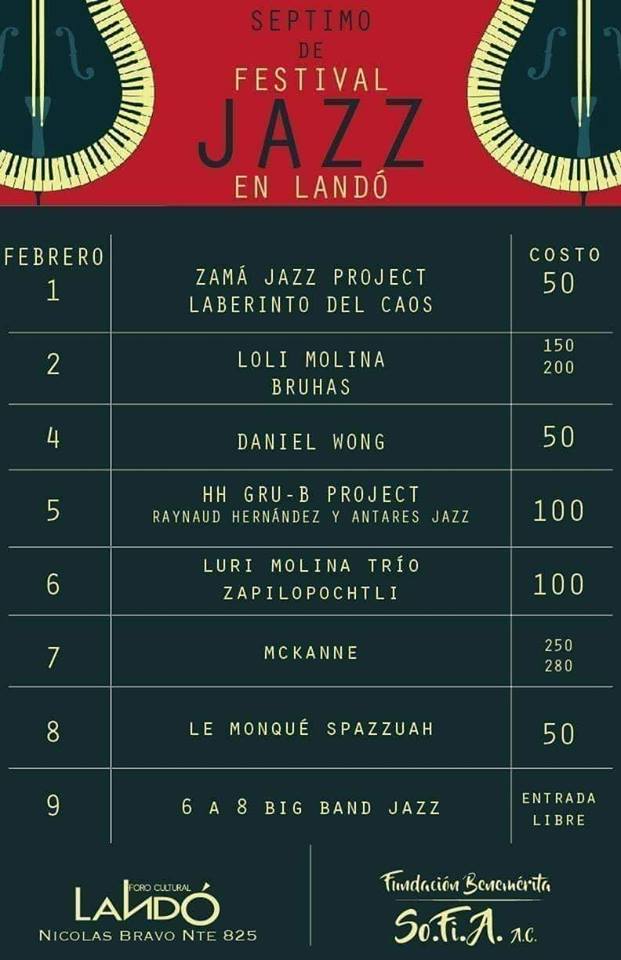 Los invito a que consulten la cartelera del Séptimo Festival de Jazz del Foro Landó, el cual termina el próximo sábado 9 de febrero. La cita es a las 21 horas, los conciertos empiezan a las 22 horas y la dirección es Bravo Norte 825, esquina con Paseo Matlatzincas, en Toluca, Estado de México.