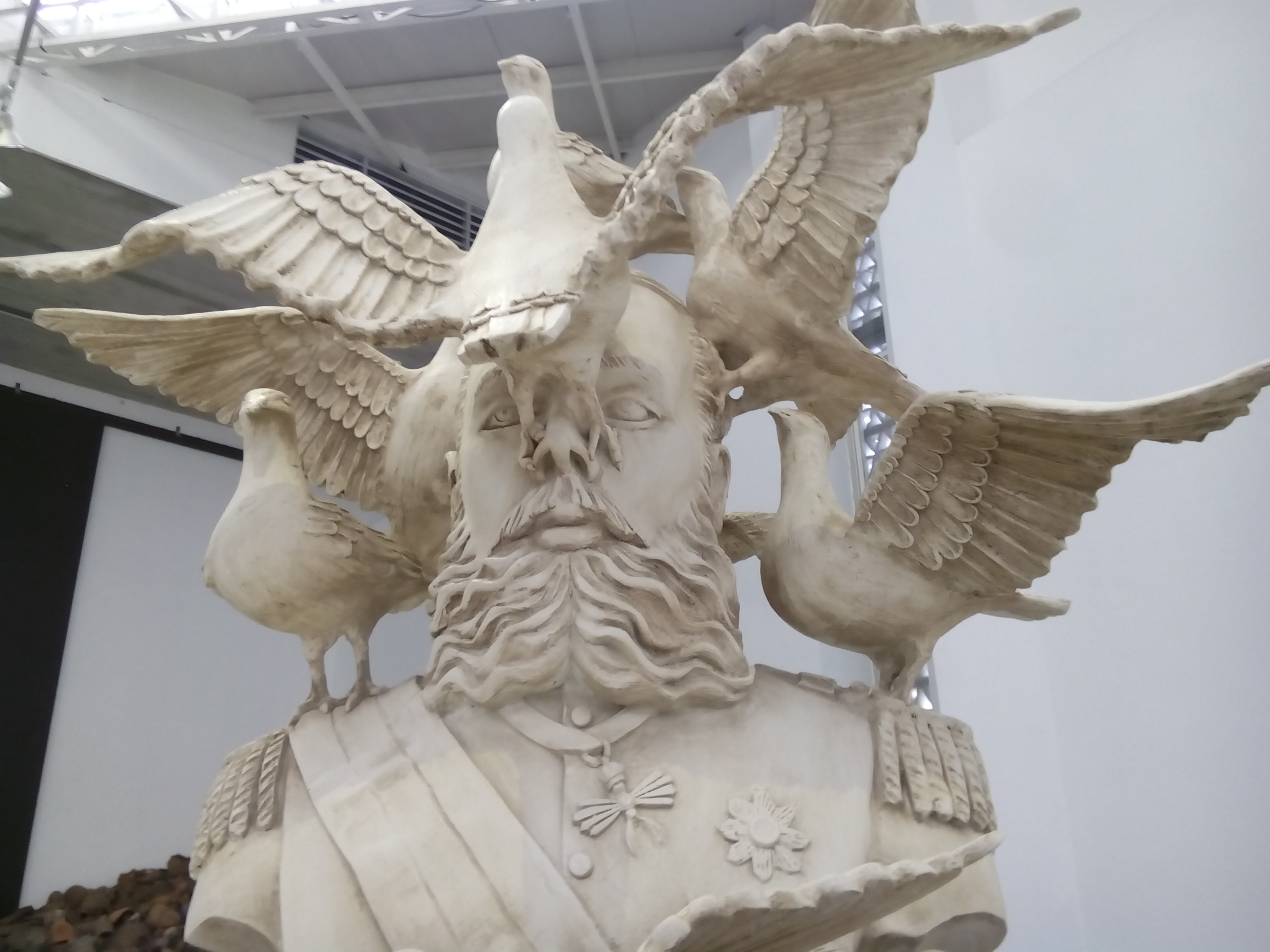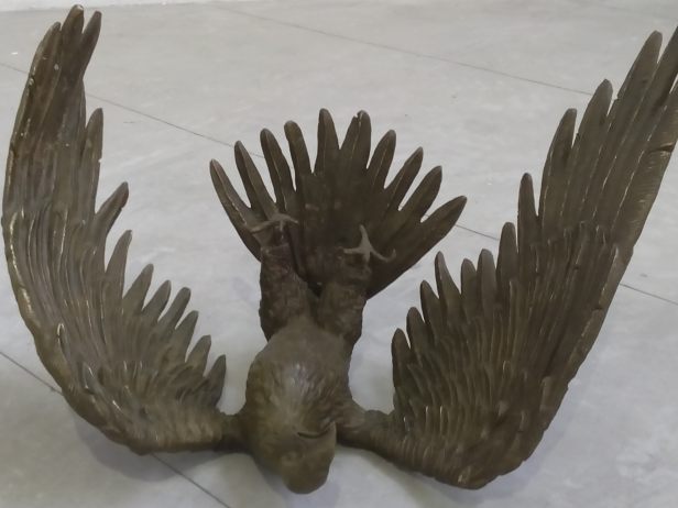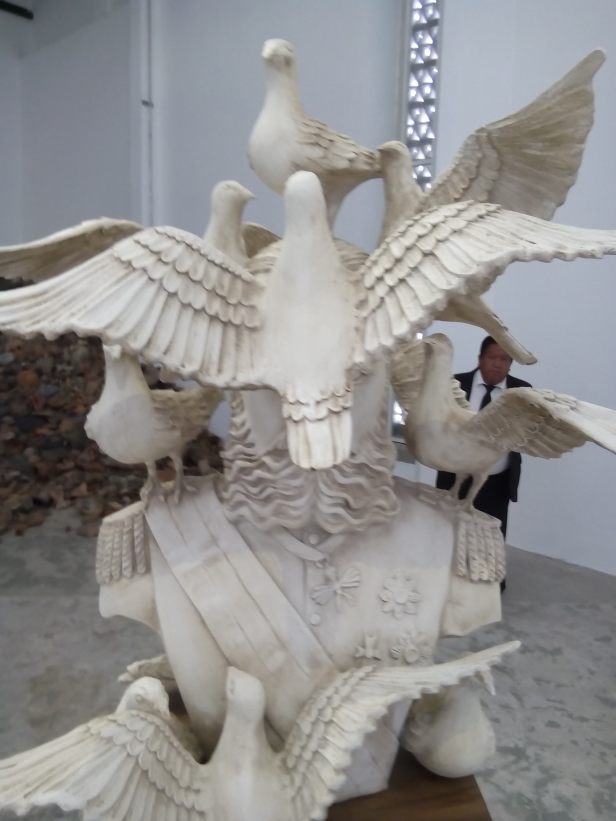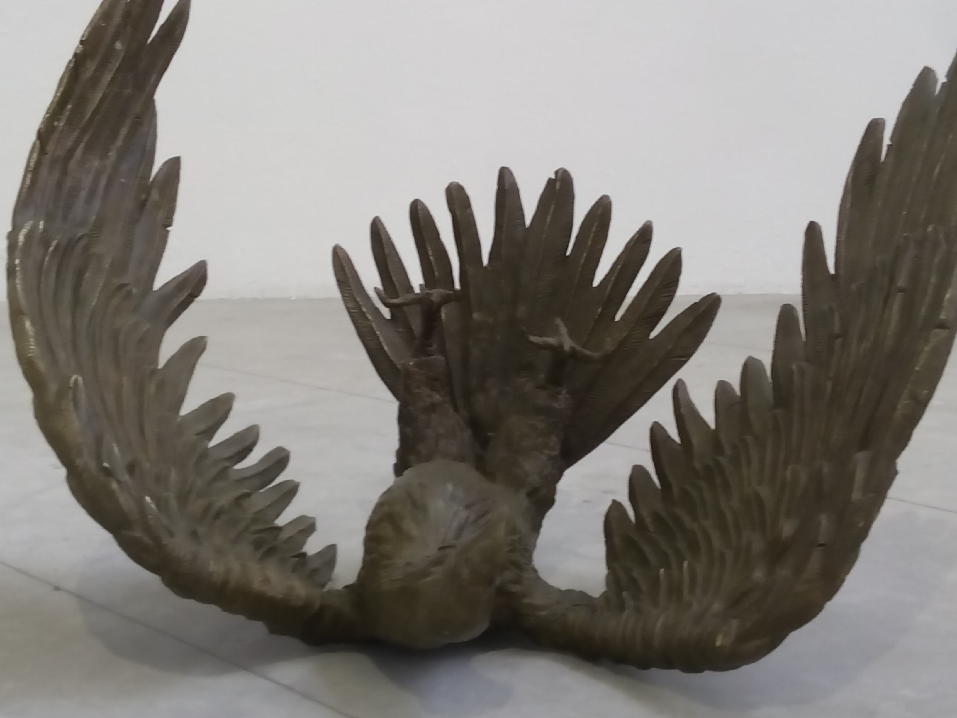 Ahí está una águila caída con el nombre de «El fracaso de la libertad», de 2014. Esta ave patas p’arriba, de bronce, me recuerda —a propósito de que hace nos días vino el artista chino Ai Weiwei a México por la apertura de un exposición en el MUAC—, el jarrón de cerámica milenario de la dinastía Han, que soltó de sus manos mientras era fotografiado. Dice el artista chino al respecto que Mao decía que: «para construir una nueva civilización había que destruir la vieja”. Y eso fue lo que hizo «simbólicamente»Ai Weiwei.