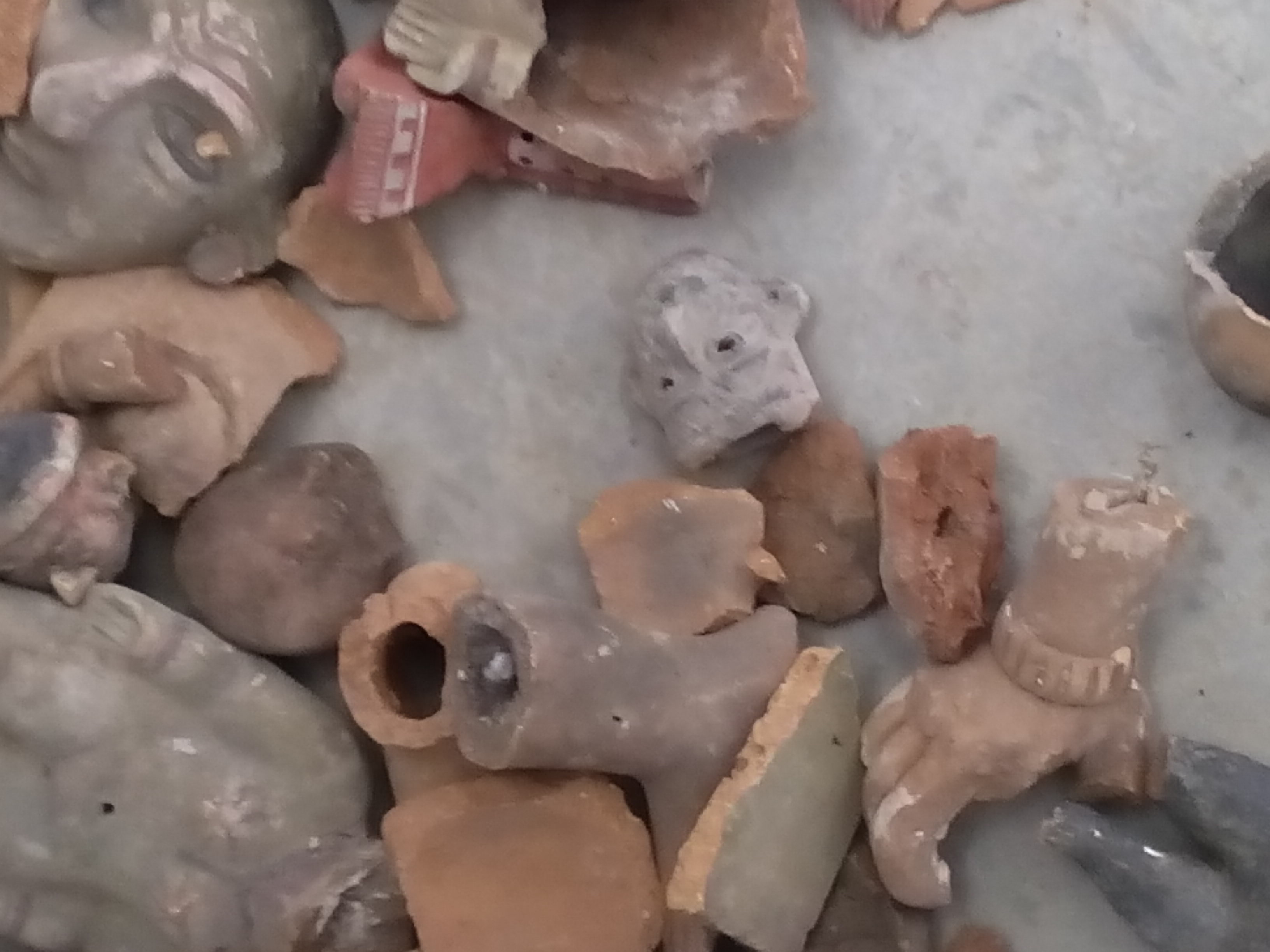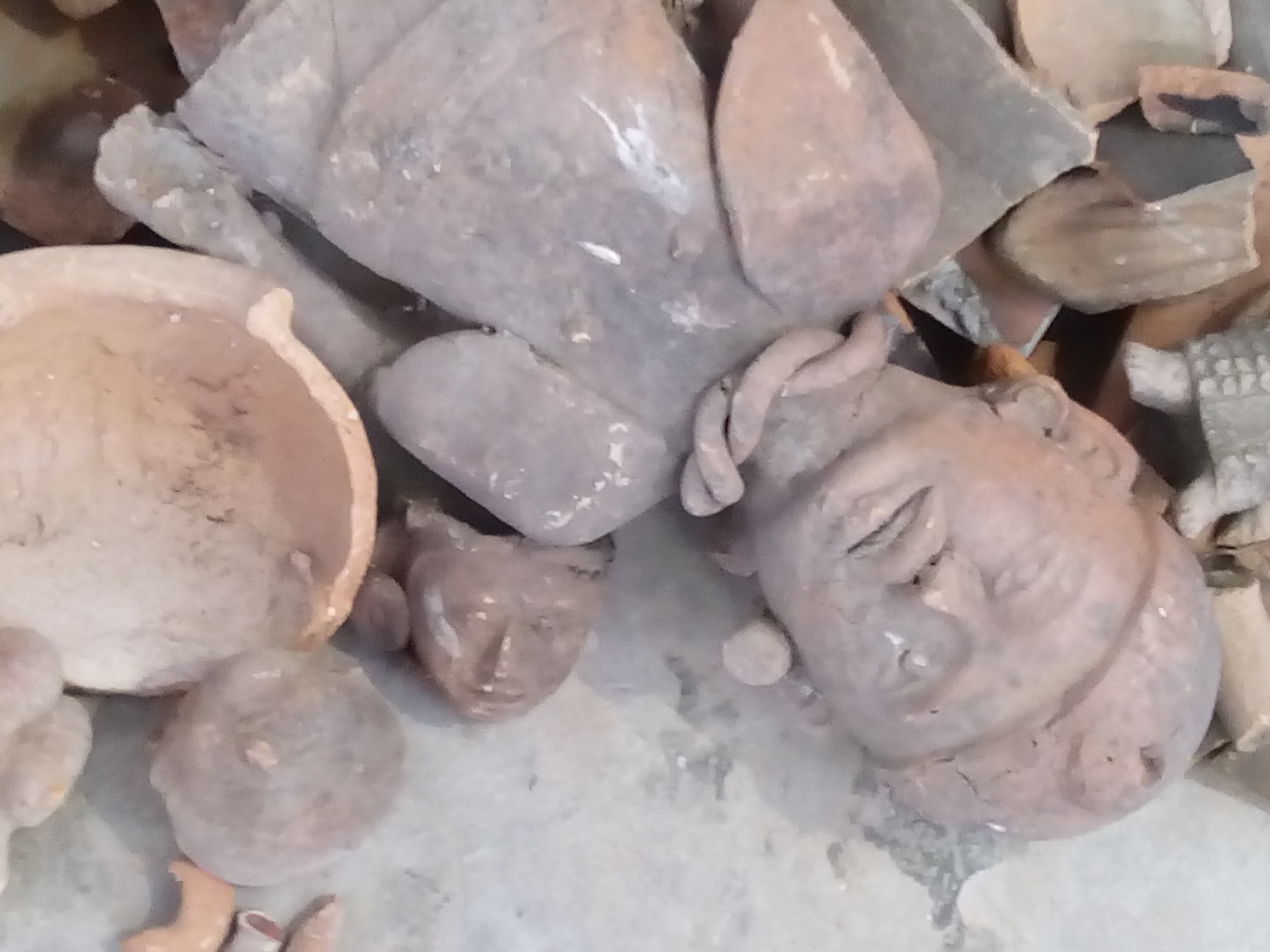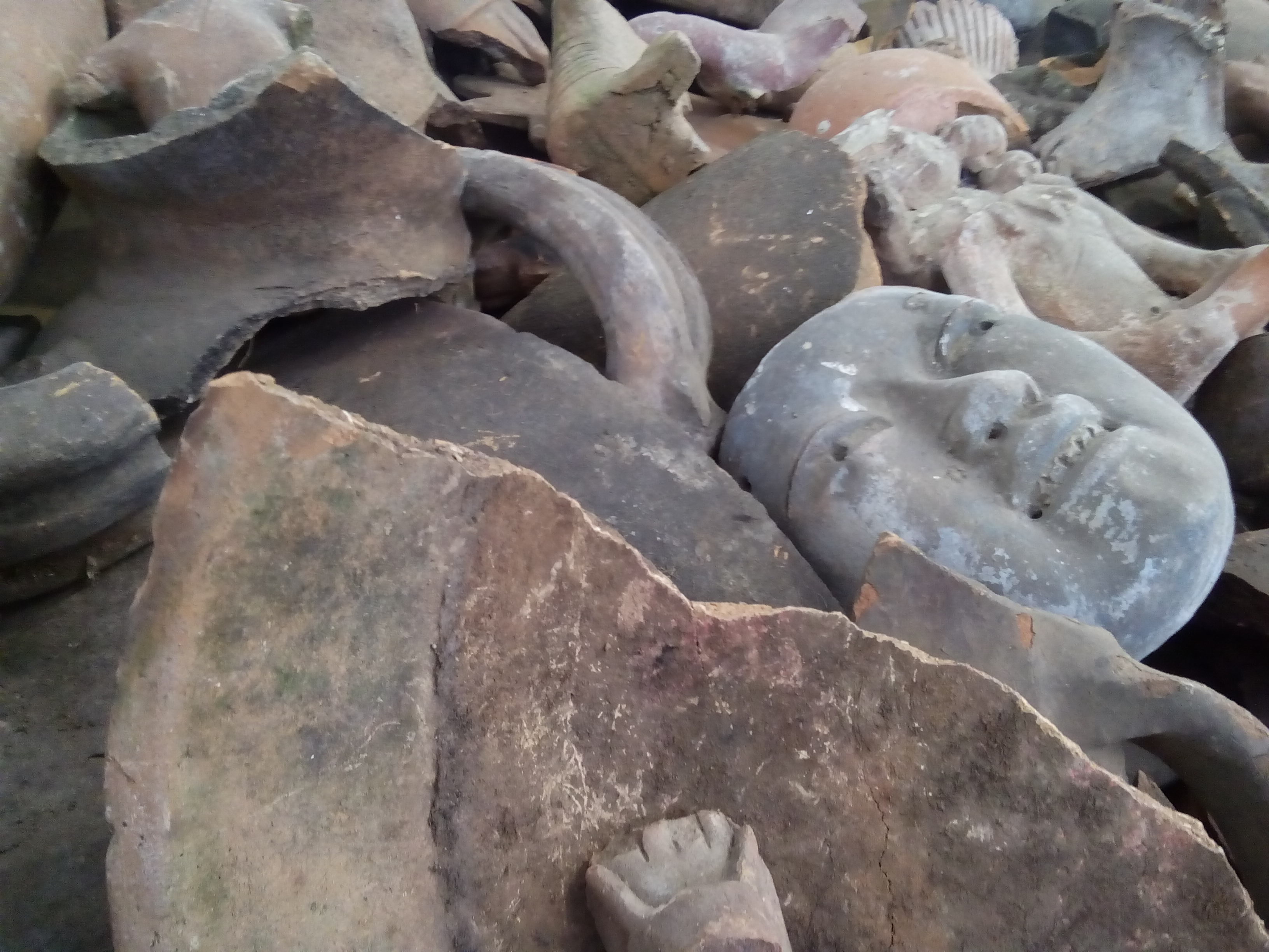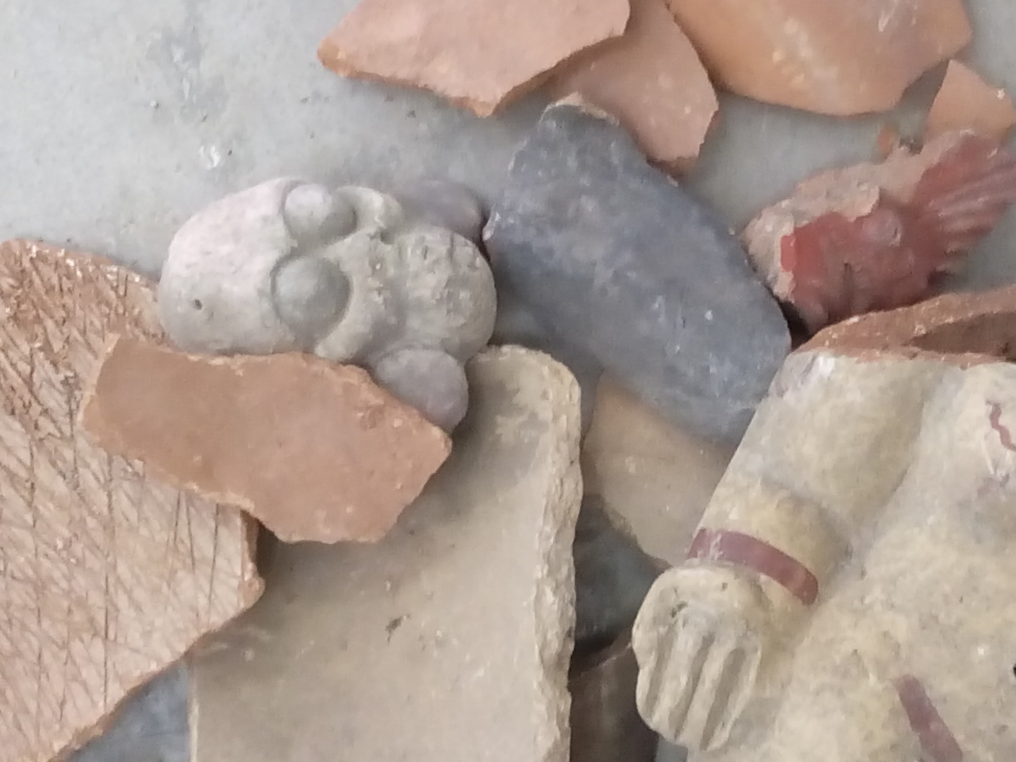 En realidad lo que ahí está reunido son puros emblemas caídos o invadidos por el tiempo —y las aves—, cerro de réplicas rotas de caras o vasijas prehispánicas recolectadas de un taller en Chapala, Jalisco, y otras en Tlayacapan, Morelos, así como paredes raspadas para intentar ver qué hay detrás de esta nueva capa puesta para esta nueva exposición.