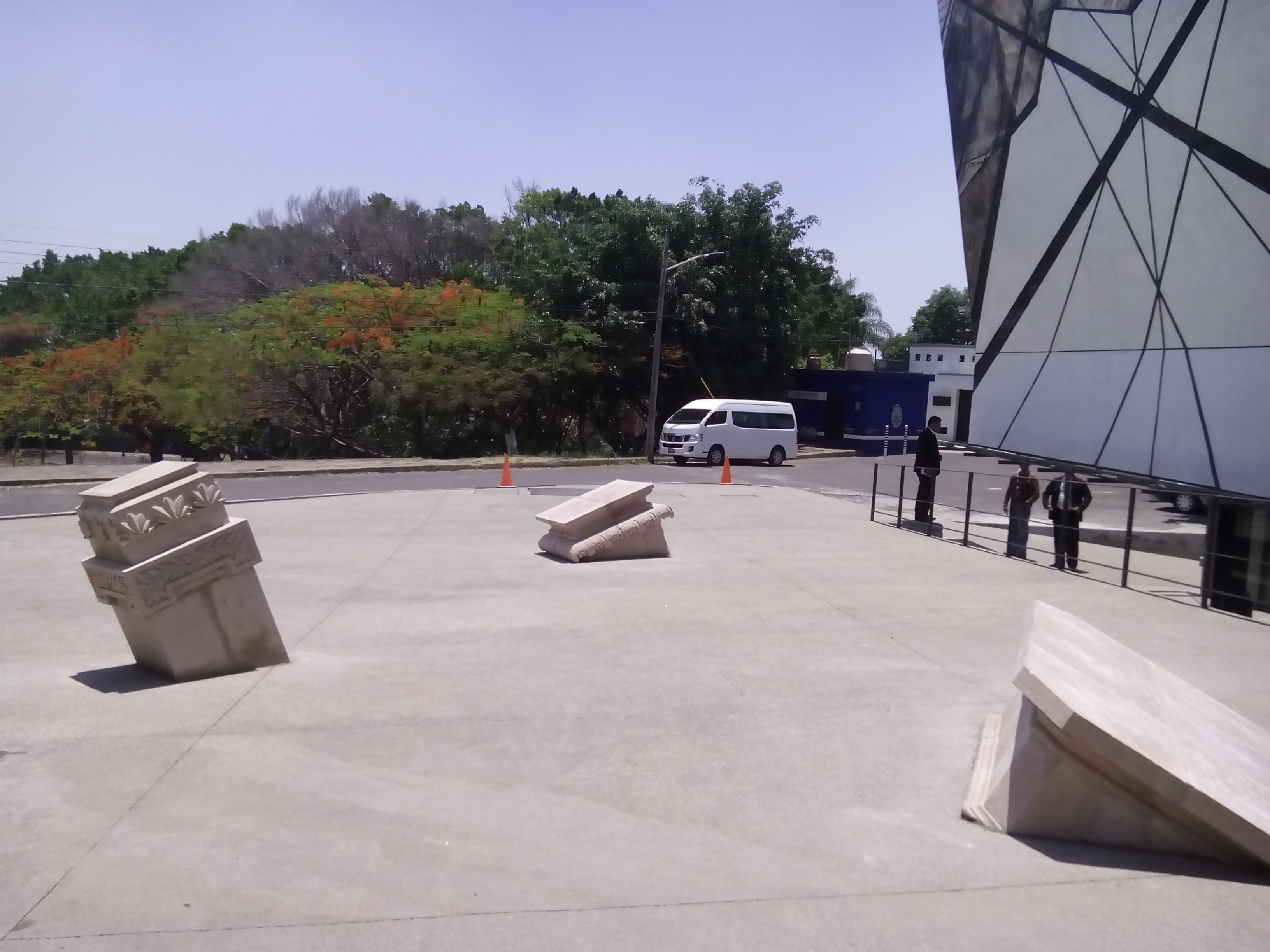 Afuera de La Tallera, frente a los murales de Siqueiros hay tres pedestales tallados en roca de cantera, Cynthia los define como «Rumores de piedra», es como si de pronto a ese Museo se le hubiera salido algunos huesos o el inicio de una historia para los que miran desde lejos la entrada del museo. Me hace sentido todo cuando la artista de cuarenta años explica que su padre es escultor, de ahí tal vez su inquietud por los antimonumentos como el de Maximiliano cagado por las palomas o la del águila caída, es decir, da la sensación de ser una crítica a lo inamovible, la patria, los padres y las instituciones.