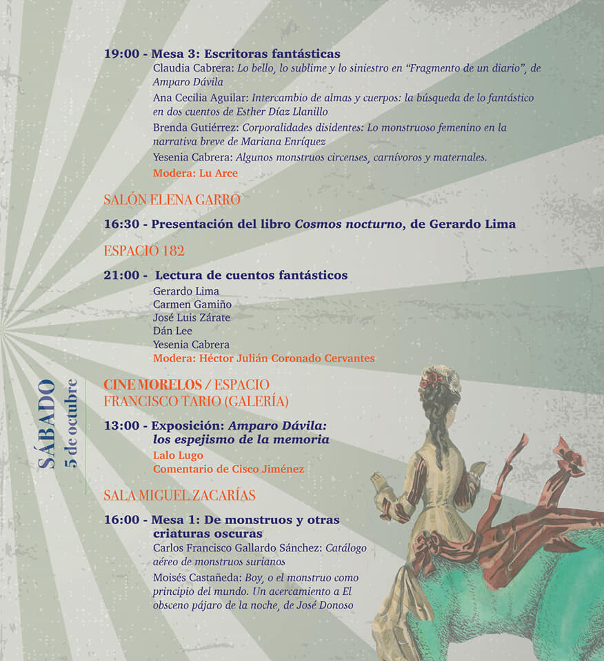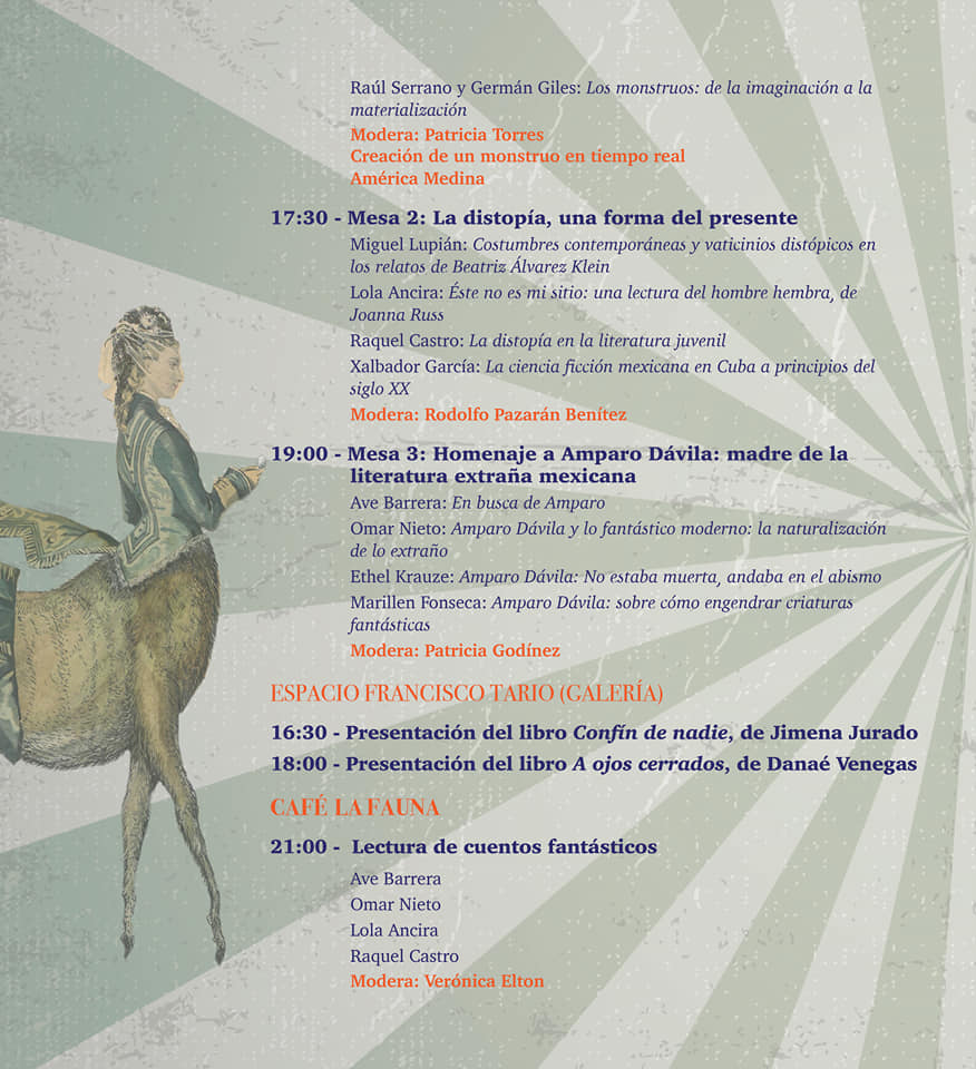 Para las 17:30 en el Salón Juan José Arreola vendrá una conversación sobre espectros, pesadillas y rarezas en la literatura mexicana, donde se reunirán José Luis Zárate para tratar de responder la pregunta: ¿cómo construir un monstruo y no morir en el intento?; Yoel Rodríguez, por su lado, desarrollará el tema del teatro como espacio de lo fantástico y su dramaturgia de lo extraño; Gerardo Lima se irá tendido sobre el autor Emiliano González y el decadentismo gótico; para cerrar la mesa, Carmen Gamiño sacará las alas de la mariposa y algunos microinfiernos de Virginia del Río.