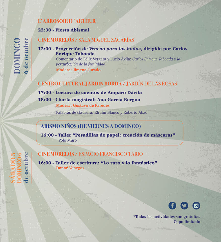 Para la noche, se llevará acabo otra lectura más de cuentos fantásticos a cargo de las escritoras Ave Barrera, Raquel Castro, Lola Ancira y Omar Nieto. Esta actividad será en el parsimonioso Café Fauna, en donde además de un buen café abismal también hay máquinas de escribir para teclear algunas historias de fantasía y terror en Cuernavaca. Para cerrar el sábado y hacer conexión con los espíritus de la noche, habrá una Fiesta Abismal en el famoso bar La Regadera de Arturo.