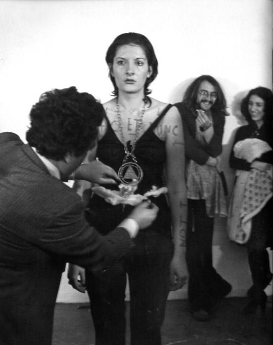 Su inmovilidad en el concierto, me recordó a la artista serbia Marina Abramovic, aquella mujer que estuvo durante seis horas, frente al público, sin moverse, para el performance «Rhythm O» realizado en 1974, en la galería Studio Morra de Nápoles, en Italia. «Soy un objeto. Me hago responsable de todo lo que pueda suceder en este espacio de tiempo. Seis horas. De 20 a 2hs», les dijo la artista de 28 años de edad en esa ocasión, en la que vivió y sufrió de todo durante ese experimento. Los asistentes iniciaron usando, sobre el cuerpo de Abramovic, flores, plumas, perfume, vino, pan, uvas, entre otros «objetos de placer», como ella misma los definió; luego, con un poco más de confianza y tiempo, viendo que la artista no oponía resistencia, pasaron a tomar los «objetos de destrucción», como cuchillos, tijeras, barras de hierro, hojas de afeitar y hasta una pistola cargada que se la pusieron en la mano apuntando hacia su cuerpo. Fueron 72 objetos los que estuvieron puestos en una mesa, para ser utilizados a como les diera en gana a los ahí presentes. Cuenta Abramovic que hasta canas le salieron después de ese infame pero artístico momento. («El perturbador experimento de una artista que llevó al público a mostrar su peor cara»; Infobae, Claudia Peiró).