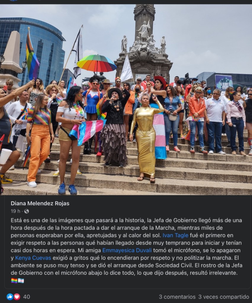 «Iván Tagle fue el primero en exigir respeto a las personas que habían llegado muy temprano para iniciar y tenían casi dos horas en espera», se lee en una foto donde se ve a la Jefa de Gobierno de la CdMx con varias personas más a las orillas del Ángel de la Independencia. La publicación es de Diana Meléndez Rojas y ella advierte lo siguiente: «Mi amiga Emmayesica Duvali tomó el micrófono, se lo apagaron y Kenya Cuevas exigió a gritos que lo encendieran por respeto y no politizar la marcha. El ambiente se puso muy tenso y se dio arranque desde la Sociedad Civil. El rostro de la Jefa de Gobierno, con el micrófono abajo lo dice todo, lo que dijo después, resultó irrelevante», finalizó.
