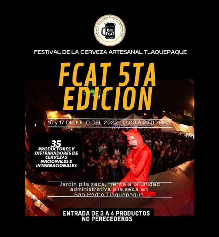 Este 16 y 17 de julio se realizará la quinta edición del Festival de la Cerveza Artesanal de Tlaquepaque, en el jardín Pila Seca ubicado frente a la unidad administrativa Pila Seca en San Pedro Tlaquepaque (FCAT). Ahí será el recinto que albergue más de 35 exponentes y distribuidores de cerveza artesanal nacional e internacional, además de contar con un área de cata, maridaje, una zona de gran selección gastronómica con platillos tanto nacionales como internacionales y música en vivo en apoyo a la escena local tapatía.