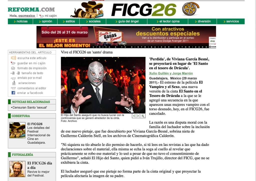 Y es que aunque siempre existió ese rumor de las segundas versiones de las películas del luchador, todo tomó otro sentido cuando García Besné, haciendo el documental Perdida (2009), que es acerca de su familia, en una charla con su tío-abuelo, el productor Guillermo Calderón, salió el tema de estas dobles versiones de las películas de El Santo que ella no conocía. “Me quedé con mucha curiosidad y empecé a hacer un poco de investigación en redes sociales y en periódicos para ver qué información había sobre la película El vampiro y el sexo. Me encontré con mucha controversia y ya que yo tenía acceso a la bodega de la productora Permanencia Voluntaria, me puse a buscar y entonces descubrí que sí existía”.