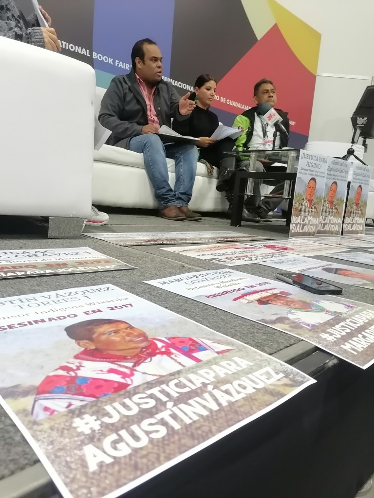 Mientras terminada el evento de cambio de estafeta, este domingo, 3 de diciembre, de la Unión Europea a España, dentro de las actividades del último día de la Feria Internacional de Libro de Guadalajara, en la sala de prensa un grupo de personas demandaban justicia frente algunos reporteros, para defensores de territorios Wixárika o de la Sierra Manantlán que han sido asesinados. Nos gobierna la impunidad.