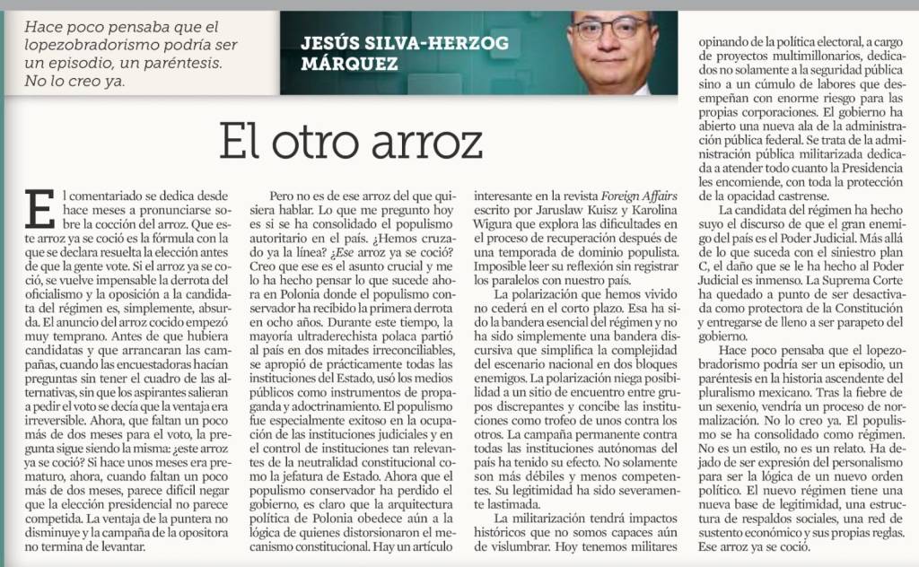 Hace poco pensaba que el lopezobradorismo podría ser un episodio, un paréntesis en la historia ascendente del pluralismo mexicano. Tras la fiebre de un sexenio, vendría un proceso de normalización. No lo creo ya. El populismo se ha consolidado como régimen. No es un estilo, no es un relato. Ha dejado de ser expresión del personalismo para ser la lógica de un nuevo orden político. El nuevo régimen tiene una nueva base de legitimidad, una estructura de respaldos sociales, una red de sustento económico y sus propias reglas. Ese arroz ya se coció».