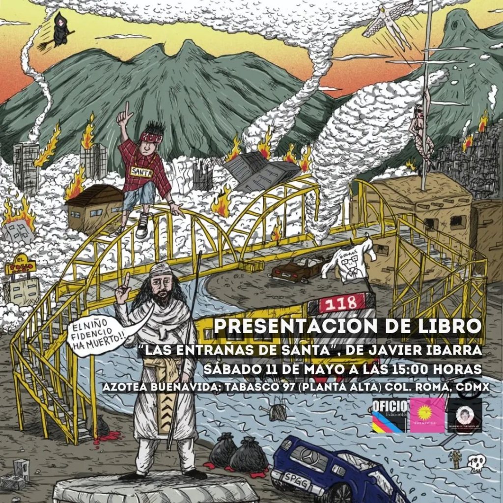 El joven cronista y editor del sitio sobre música y cultura pop, Revenge of the Nerds Mx, Javier Ibarra (Ciudad de México, 1987) presenta este sábado, 11 de mayo en la Ciudad de México, su nuevo libro que, dice, es uno que está entre «la crónica y la ficción». Se llama Las entrañas de Santa (Edición EsOficio), y «los textos transcurren cuando está por tocar tierra el huracán Alex y el narcotráfico en el noreste mexicano comienza a ser algo cotidiano».