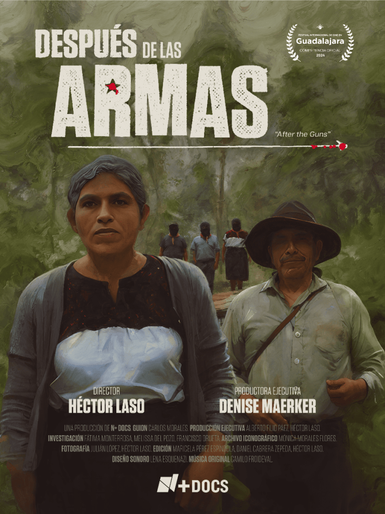 Otro documental que se estrenará en el FICG, relacionado con temas políticos en México, y es producido por la periodista Denise Maerker -que para esas fechas ya habrá cerrado su ciclo en su noticiario de radio Atando Cabos que duró 23 años en Radio Fórmula y el 4 de junio es su última emisión- y que es dirigido por Héctor Laso, se llama Después de las armas, que es un proyecto original de N+ Docs y que en 75 minutos -dice el comunicado de este largometraje- «explora los riesgos y sacrificios que cinco ex integrantes del EZLN (…) Benito, Elisa, Mario, Felicia y Luis Miguel (que) hablan sobre las motivaciones del movimiento armado mientras reflexionan sobre las transformaciones que les dejó la lucha armada y la herencia que este aprendizaje deja para las generaciones futuras».