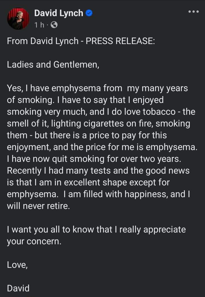 El creador de películas como Eraserhead, Terciopelo Azul, El hombre elefante, Corazón salvaje y Mulholland Drive, así como la serie Twin Peaks, explicó que recientemente le hicieron una serie de pruebas y pudo decir que la buena noticia es que se encuentra en excelente forma excepto por el enfisema. Así que está «lleno de felicidad». Al final expresó que aprecia con mucho amor la preocupación se sus seguidores.