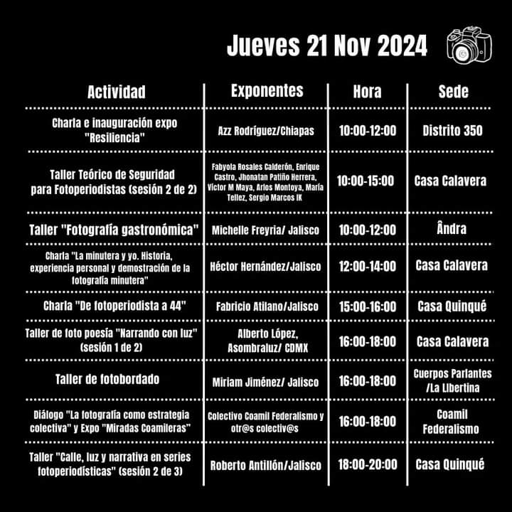 Para sus organizadoras, entre ellas la fotógrafa Claudia López, «este no es un evento, sino un movimiento fotográfico donde ninguna mirada está por encima de la otra», por lo que su programación que abarcará tanto exposiciones como charlas, talleres, revisiones de portafolios, una velada fotográfica y trueque de fotografías impresas, busca enriquecer a fotógrafos y también al público en general.