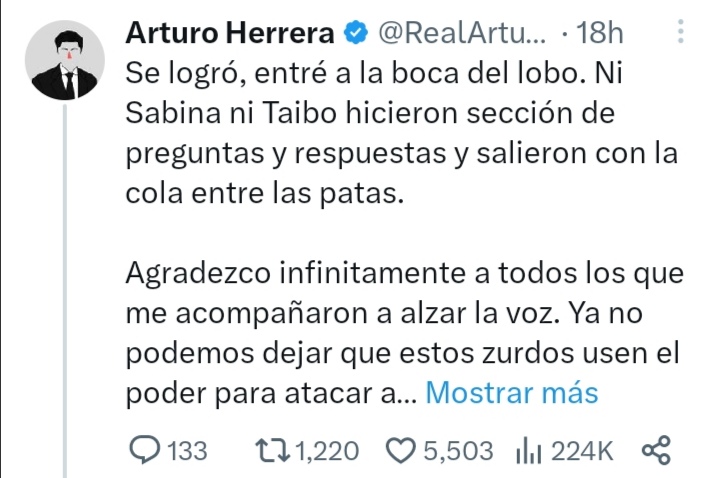 Arturo Herrera, tuitero con la cuenta en @RealArturoH, quien ya había advertido desde esa red social que asistiría a esta presentación, reclamó que Sabina Berman había sobornado a un juez, para que dictara sentencia a favor de quien ya la había sobornado con 100 mil pesos, también denunció que Paco Ignacio Taibo II, compró 26 mil libros a los hijos de un editor español amigo suyo, de los cuales además solo se han vendido siete mil, esta última información la retomó el denunciante de la revista Eme Equis, pero yo encuentro esa información en esta nota de El Gráfico de El Universal que pueden leer aquí.