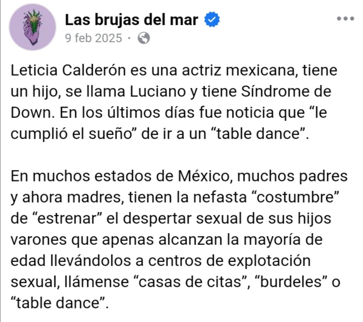 Las Brujas del Mar, una colectiva feminista que se autodenomina radical, son conocidas por su postura abolicionista respecto a la prostitución. El subrayado del término “radical” me parece peculiar, ya que, en mi opinión, el feminismo, o los feminismos, en sí mismos son radicales. Cuestión de enfoque, supongo. A través de sus redes sociales, afirmaron que el hecho de que un hombre tenga discapacidad (así escrito en su publicación de Facebook) o una capacidad diferente (como lo expresaron en X) no justifica recurrir a la explotación sexual de mujeres en ninguna circunstancia.