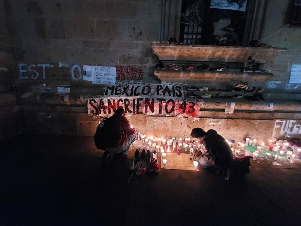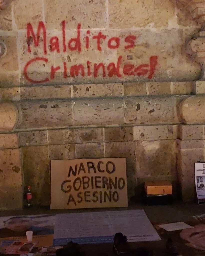 «Narco gobierno asesino» se lee en un letrero. «Ayotzinapa, crimen de Estado» y «Teuchitlán, vergüenza nacional», fueron otras frases que estaban escritas en pancartas y mantas.