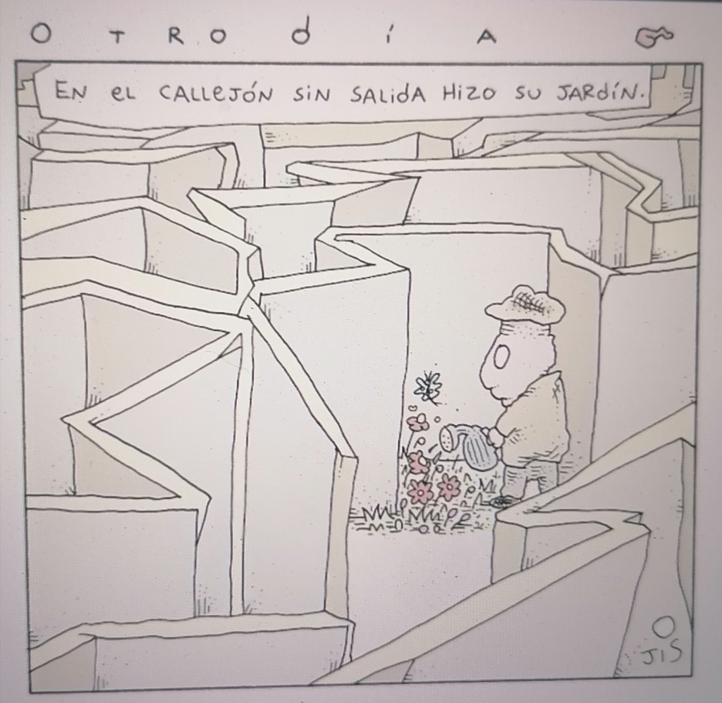 Dice el monero JIS en un ya clásico dibujo surrealista y onírico con el que termina el documental Molusco, de Mauricio Bidault, sobre su vida y su obra monera, el cual ya vi y se estrenará el próximo 13 de junio dentro del Festival Internacional de Cine en Guadalajara, que “En el callejón sin salida hizo un jardín». Bueno, así fue mi domingo de elección del poder judicial, regué mi jardín, mi jardín verde olivo para estar a la moda ahora que los militares son «pueblo uniformado».