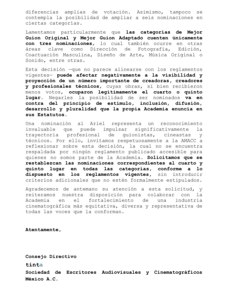 Este cambio de la AMACC es producto de la carta que publicó Tinta Escritores audiovisuales y cinematográficos México A.C., que compartimos aquí abajo, en la que lamentan que particularmente en las categorías tanto de guion original como adaptado cuenten solo con tres nominados en lugar de cinco, como señala el Reglamento del Comité de Elección de Nominaciones en su artículo 8, en el que se advierte que se nominarán a las cinco películas más votadas.
