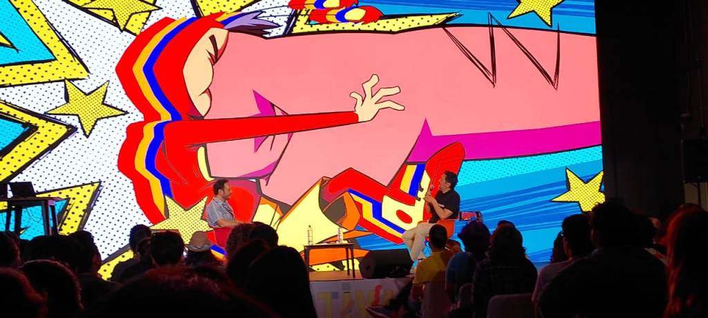 Yo iba a ver cortometrajes de lo mejor de Annecy 2025 —¿por qué no hay más funciones de los cortos del prestigioso festival de animación de Francia?—, a un kilómetro de Ciudad Creativa, pero acabé conociendo al director japonés John Aoshima, director en Gravity Falls y American Dad! y codirector de Ultraman Rising, donde además de contar cómo desde niño, uno de familia japonesa que emigró a Estados Unidos donde él nació, Su pasado oriental con su vida occidental lo llevó a que sus ilustraciones tengan algo de esos dos mundos, esas dos culturas. Su participación en la legendaria serie de Los Simpson lo dice todo, vemos a la familia amarilla sentada en una banca, intuyo que es Tokio, personificando a personajes emblemáticos de la caricatura japonesa.