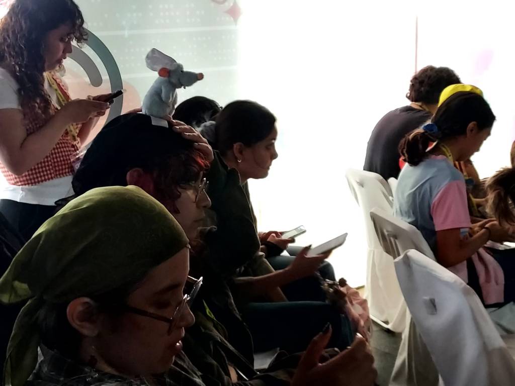 Al llegar por mi creditación, el mediodía del miércoles, un colega me dijo que todo es muy raro en este festival, jóvenes intercambiando stikers como si fueran monedas preciosas, quienes además hacen dibujos en libretas aterciopeldas o tabletas, algunos parecen jóvenes veinteañeros replicantes de Guillermo del Toro que vagan por todos lados con un Frankestein o un Pinocho en el hombro, otres llevan puestos en sus cabezas peluches con roedores cocineros o pollos muy amarillos. Los nerds y los freaks hacen amistad en Pixelatl, eso no está nada mal.