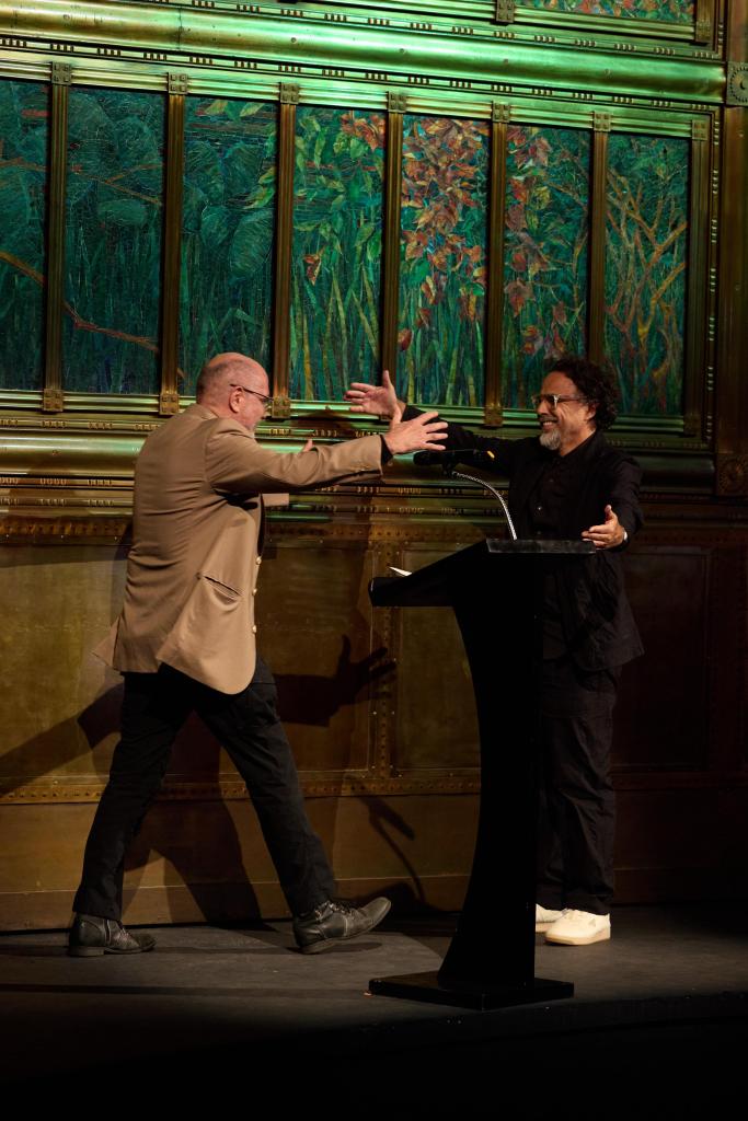 El cineasta subió al escenario entre aplausos y, con visible emoción, invitó a Guillermo Arriaga a unirse a él. En un gesto simbólico y profundamente significativo, ambos compartieron el escenario ante una sala llena que los recibió con una ovación por su reencuentro. Previo al inicio de la proyección, Iñárritu y Arriaga compartieron unas palabras en conjunto en el que anunciaron su reconciliación:
