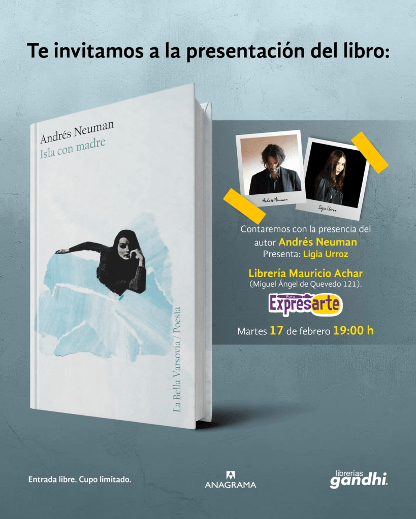 Del 11 al 15 de febrero Andrés Neuman visitará México, ¿la razón? Participará en el San Miguel Festival de Escritores y Literatura, un festival internacional celebrado anualmente en San Miguel de Allende, Guanajuato. Posteriormente estará en la Ciudad de México, en donde presentará su poemario Isla con madre (La Bella Varsovia, 2023), el martes 17 de febrero, a las 19:00 horas, junto con la escritora nicaragüense-mexicana Ligia Urroz.