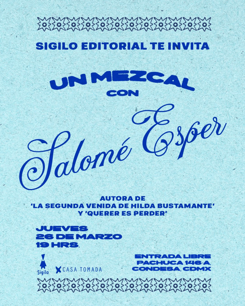 Coloquialmente en México, decir que ya es «juevebes», es porque el jueves ya se siente como viernes y dan ganas de beber algo y animar el fin de semana que ya se asoma. En esta revista nos atrevemos a decir que este jueves, 26 de marzo, a las 19 horas, en Casa Tomada (Pachuca 146 A, Condesa, Ciudad de México), además de un mezcal con sabor a qué siga la fiesta, habrá sobre todo buena literatura para disfrutar con las obras de la fantástica escritora jujeña que vive su cuarta década de vida, Salomé Esper.